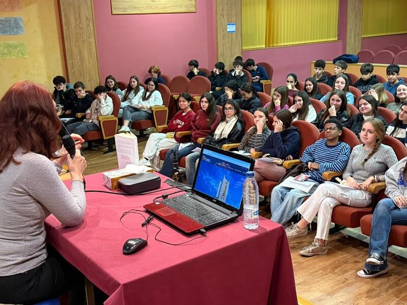 El alumnado de último curso de ESO compartió una agradable charla con la autora de la premiada novela "Un testigo llamado Cervantes" junto a su profesor de Literatura Aitor Sánchez. Interesados por conocer la vida de nuestro insigne escritor formularon preguntas y se sorprendieron por las hazañas vitales del autor del Quijote.